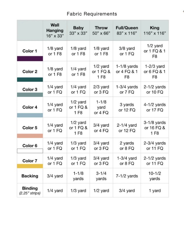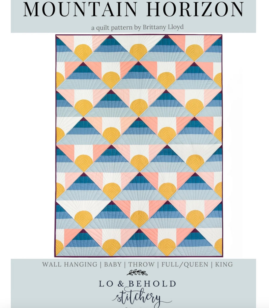 Mountain Horizon is inspired by the way the sun rises and falls over a mountain range, and the resulting colors of the horizon. Each block plays off the next with the sun coming between two mountain peaks. This pattern is a twelve page booklet that includes helpful diagrams, thorough instructions, and alternate color-way ideas. This pattern is traditionally pieced; templates are probided for the curved pieces. This pattern is written for five sizes: Wall Hanging (16" x 33"), Baby (33" x 33"), Throw (49" x 65"), Full/Queen (81" x 114"), and King (114" x 114"). Since this pattern is block based, you can easily add or subtract blocks to customize size. Skill Level: Intermediate
