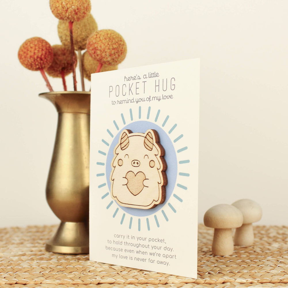 These pocket hugs are a delightful reminder that you're loved. Perfectly giftable for times of separation--from long distance relationships to back to school, they make an extra special way to let someone know you're thinking of them whenever nervous, scared and anxious feelings arise. Approximately 1.2 inches wide by 1.6 inches tall, made from 1/8" thick, sturdy baltic birch.