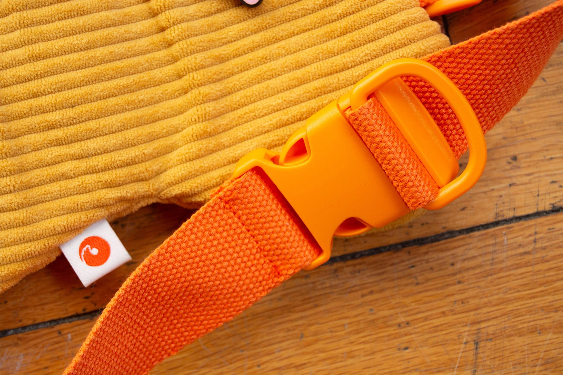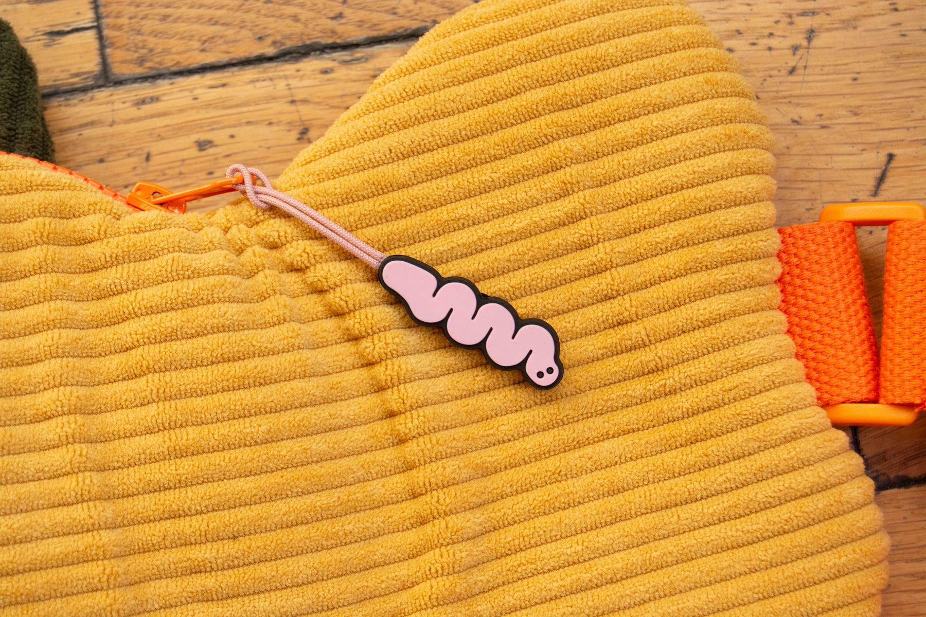 This here Fish Bag is the Fruity variety. He's 17" x 6.75" and comes with a fruity little rubber worm zipper pull, D-ring and buckle matched to the adjustable 1.5" wide cotton strap, and can be adjusted to be between ~36" - 80" long (91cm x 203cm) (including the length of the bag) with the included strap-extender. He can be worn as a crossbody or a (large) fanny pack.