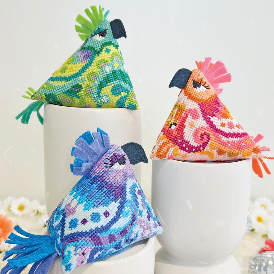 Let's get groovy! These fab feathered friends are easy to make with just a few straight seams and they make gorgeous pincushions, pattern weights, or sachets. Pattern includes three charts, plus illustrated step-by-step instructions and templates for felt accents.
