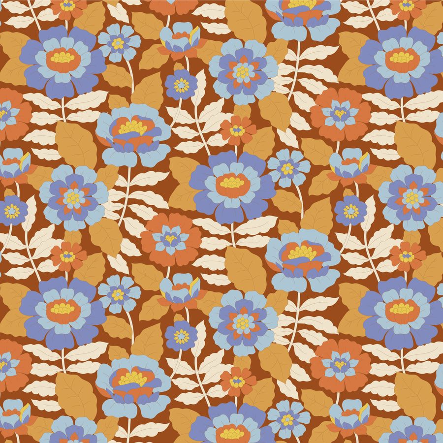 Tilda Fabric's Wallflower collection is designed by Norwegian designer Tone Finnanger. "Wallflower is an ornamental collection loosely inspired by and my somewhat romantic take on design styles popular in the 1960s and 70s." The collection has two distinctive color stories. One is sweet and fresh with vintage reds, greens and pinks with hints of blue and sour yellow. The other is more of a nod to the 1960s and 70s, with caramel, blue, ginger, ochre and thistle tones.  Fabric is OEKO-TEX(R) class II certified.