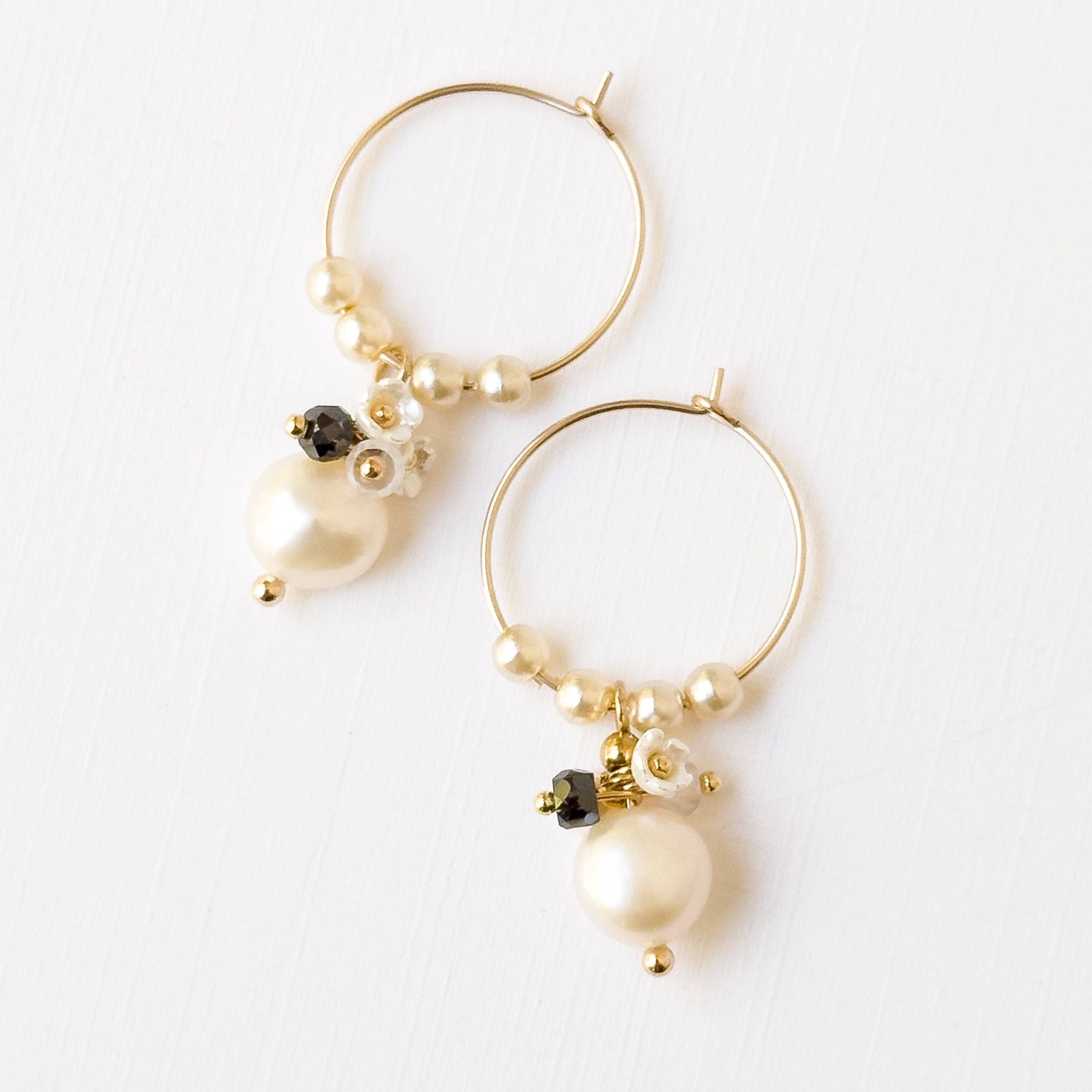 Charming gold-filled hoops featuring a pearl, tiny glass flowers, and a black bead for a chic, romantic touch. Handmade in our Vermont studio, these lightweight earrings add elegance to any look — perfect for everyday wear or gifting. Product Details: Hoop size: .5" (16mm) Materials: gold-filled, pearl crystal flowers, and beads Lightweight and comfortable