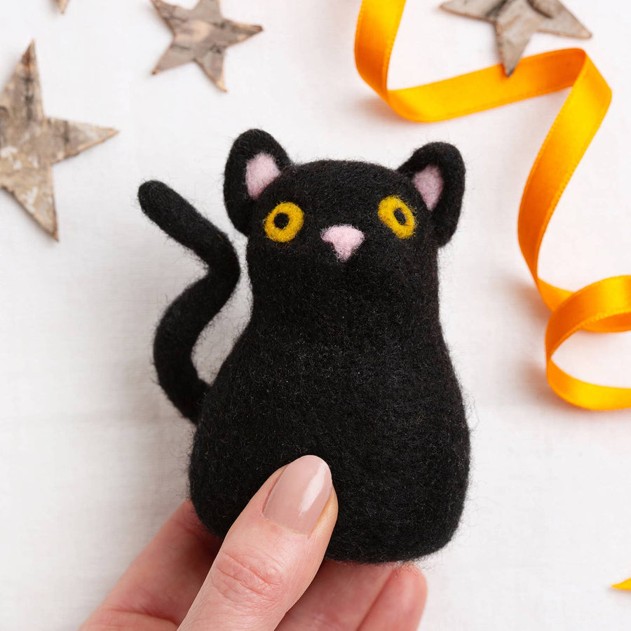 Halloween Cat Needle Felting Kit. This feline is far from ferocious, we think it would be spooked on a furr-ightful Halloween evening! We can't get enough on its wiggly tail and adorable button pink nose. Want to make your own lucky black cat? Everything is included in this easy level kit, for you to get crafty with. Once complete, this pocket size kitten would make a great addition to any cat lovers life, all year round. Each Kit Includes: Cat Needle Felting Pattern 120cm Black Epic Extreme Yarn 10cm Baby Pink Cheeky Chunky Yarn 10cm Mustard Cheeky Chunky Yarn 2 x Felting Needles Foam Board SKU: FF060 Skill Level: Easy Sizing: The Cat will be approximately 17.5cm (7in) in circumference (at widest) and 8.5cm (3.25in) tall when finished. Yarn Info: Epic Extreme 100% Merino Cheeky Chunky 100% Merino WARNING - Kit includes sharp needles.