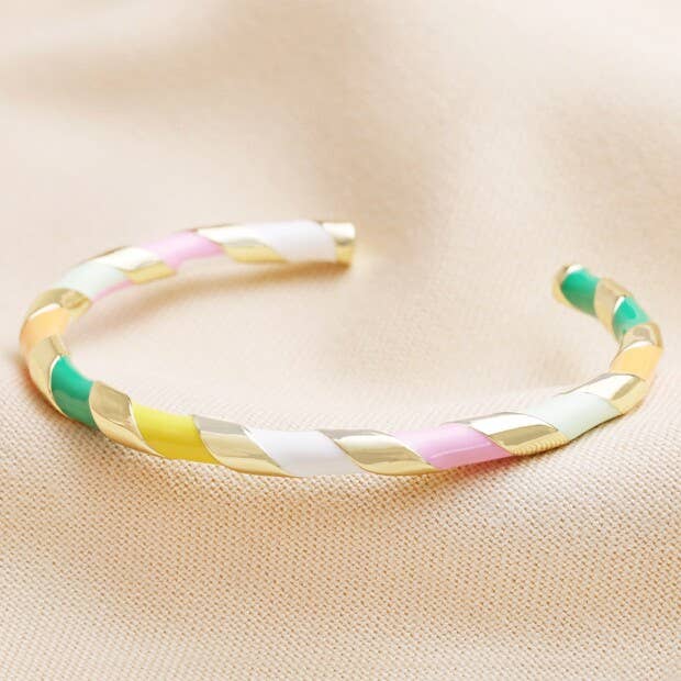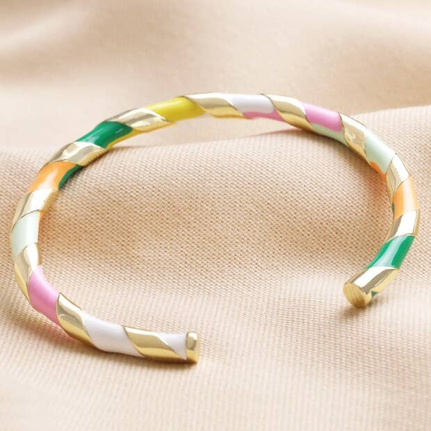 A glossy enamel infill stretches around the bangle in a twisted design.