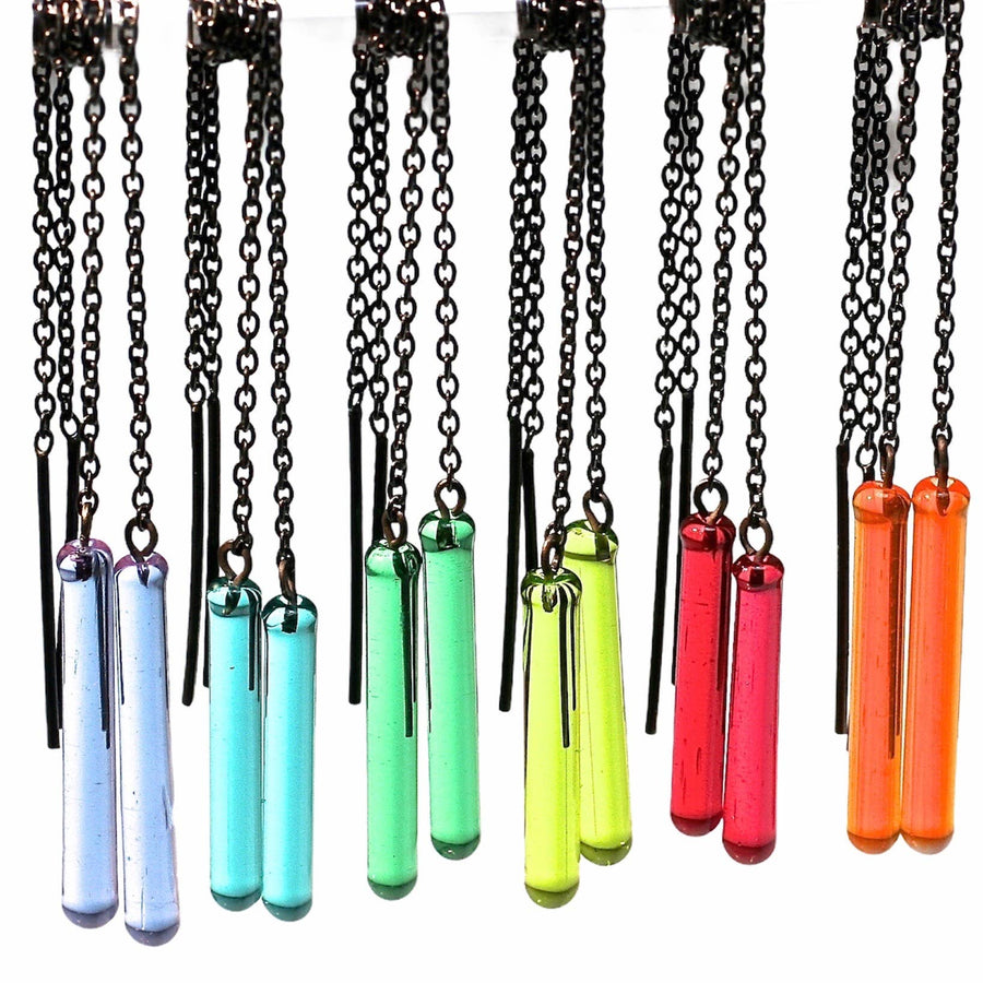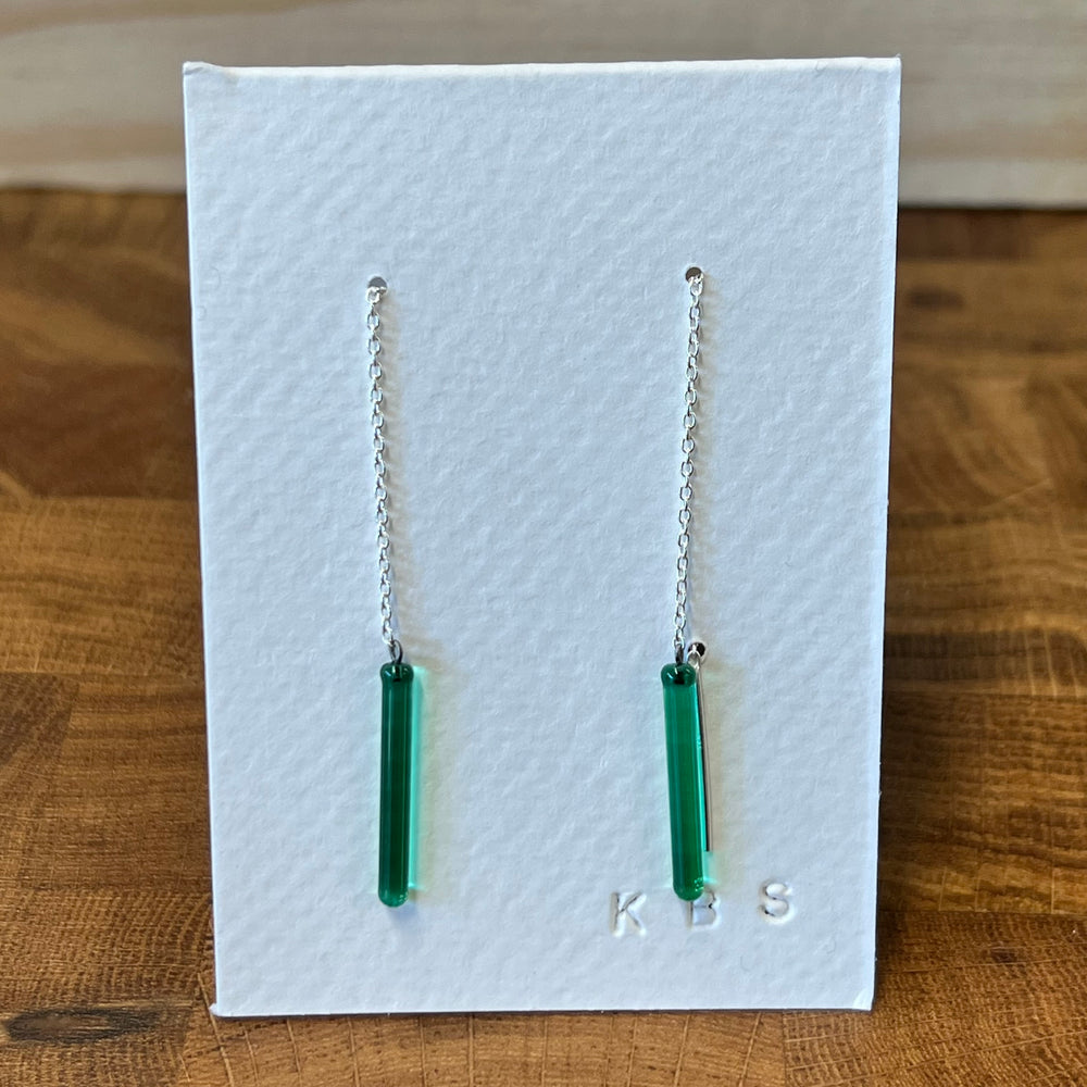 By Krista Bermeo Studio. A best seller year after year, these light-weight, versatile earrings can be worn short or long depending on the look you want. To wear threaders, pull the post end through the ear lobe then adjust the chain to your desired length. Torch worked glass and sterling silver. Glass is approximately 1.25 cm.