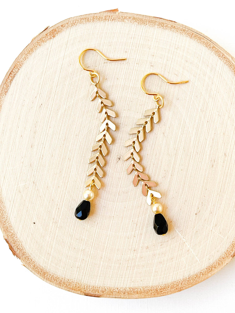 Dainty dangly 2" long matte electroplated gold Chevron earrings with a tiny crystal pearl and black drop beads, the ear wires are 24K gold plated.