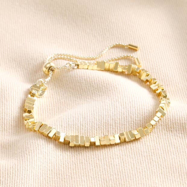 With a sturdy golden box chain fastening with an adjustable slider, polished rectangular beads sit along it glinting in the light.