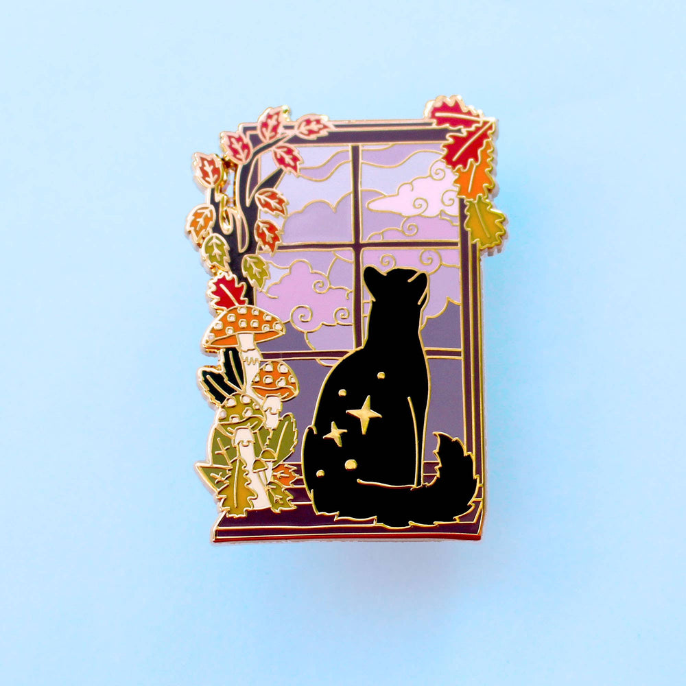 There’s nothing quite like staying indoors cosy whilst a storm rages outside! This evocative enamel pin features a black cat looking out at pink stormy clouds, adorned by fall mushrooms and leaves.