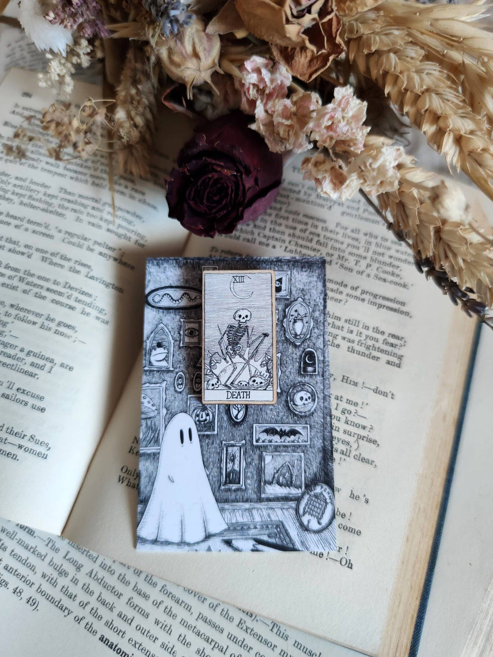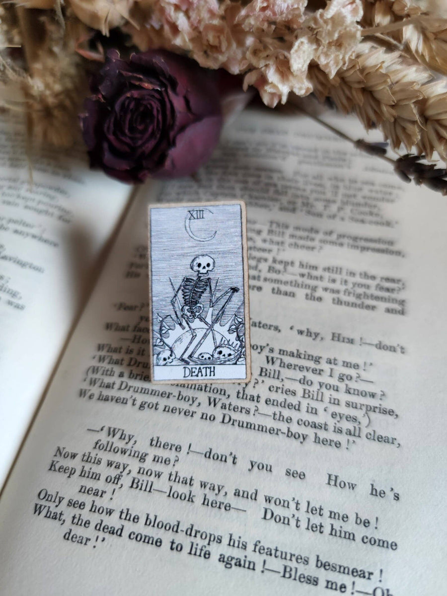 A spooky little tarot card on a lovely sturdy wooden pin; the design, from an original ink drawing by Jon Turner, is printed onto sustainably sourced textured maple wood, and then lasercut, with a pin back and rubber clutch to the reverse. Approximately 5cm (2 inches) tall. Presented on a backing card.