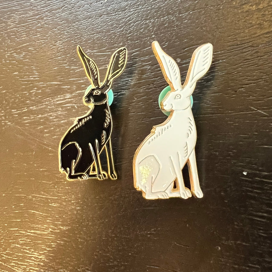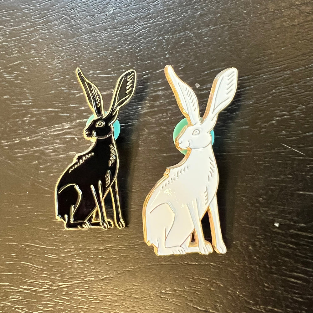 Enamel pins of our original sitting hare design. Pins are approximately 2" tall. These pins are taller than the enamel sitting hare needle minder.