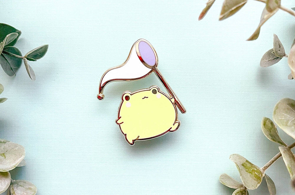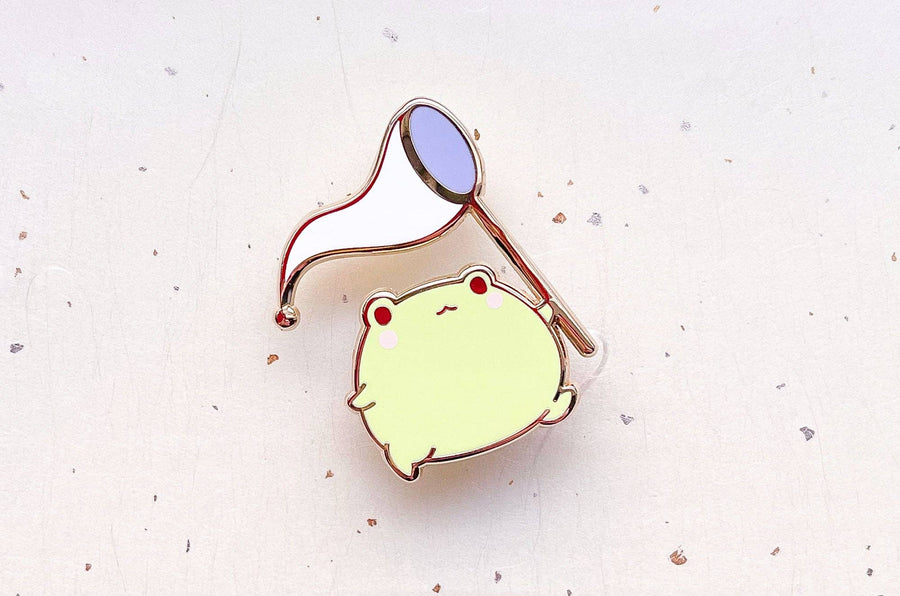This cute Gogo the Frog and Butterfly Net enamel pin features my Gogo the Frog character running with a butterfly net in his hand. This hard enamel pin is set on a highly-polished gold-plated metal with two posts on the back and measures around 1.5". THE FEATURES - Highly polished gold-plated metal. - 1.5″ hard enamel pin. - Has two posts on the back to secure the pin and prevent rotation during wear. - Features green, purple and white accents. - The Gogo the Frog and Butterfly Net illustration is based on my original artwork. - Stamped with “Alum & Ink” on the back. -