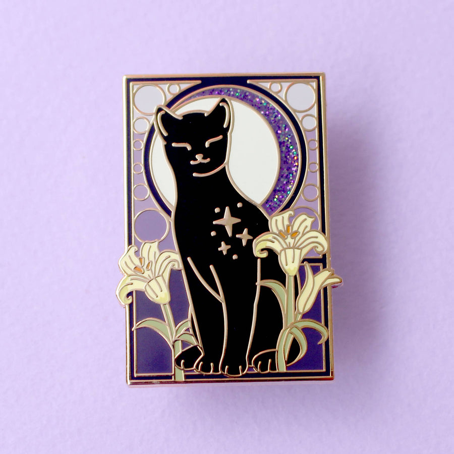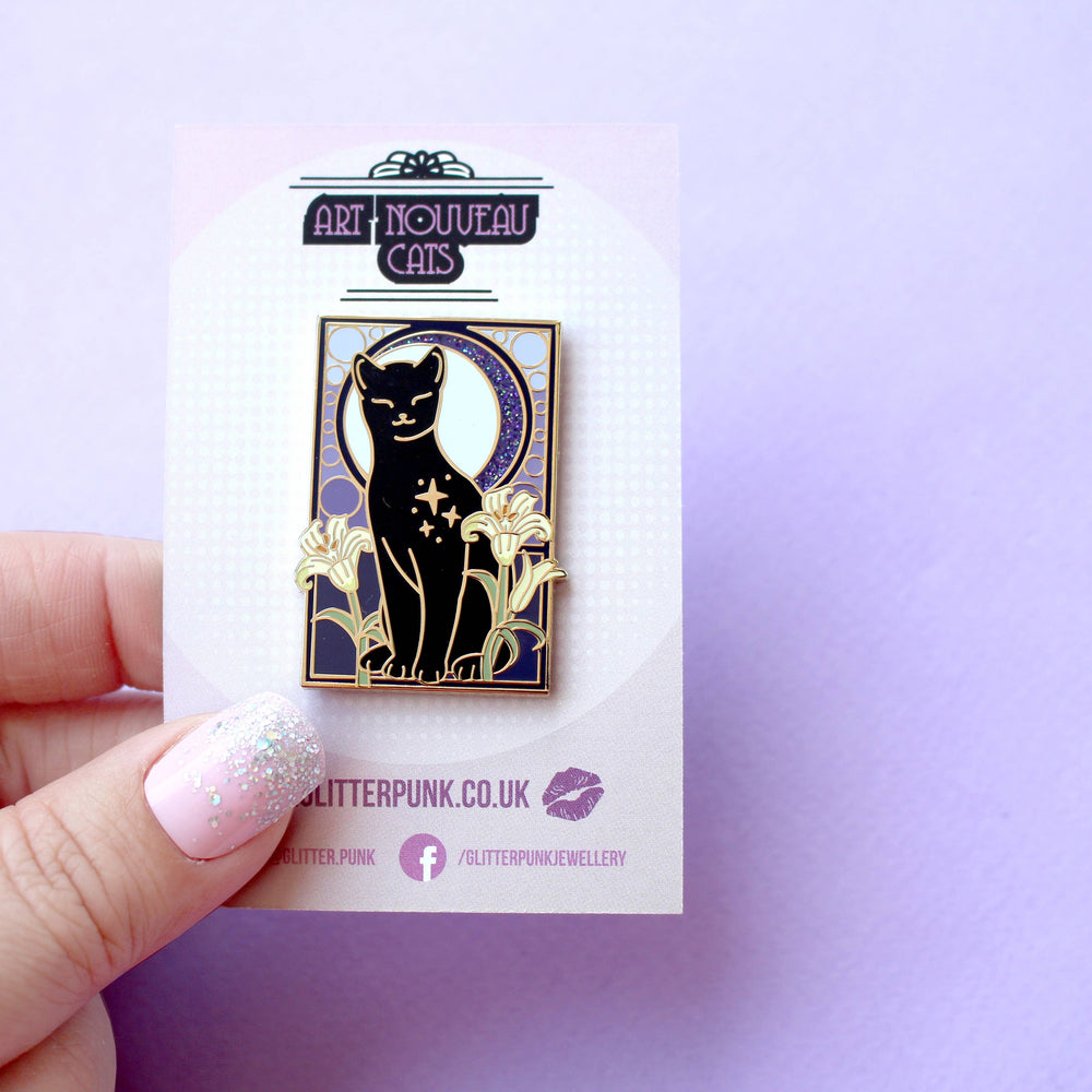 This super sweet Lily Cat enamel pin features a calm black cat surrounded by lilies, in front of a glittery moon set against an ornamental purple art nouveau background. The pin is secured by two purple heart backs and comes on a special ‘Art Nouveau’ Glitter Punk backing card, making it perfect for a gift or to keep as a special treat for yourself. This pin is part of my Art Nouveau Cats collection – 8 enamel pins based on the fabulous 19th/20th century art movement.