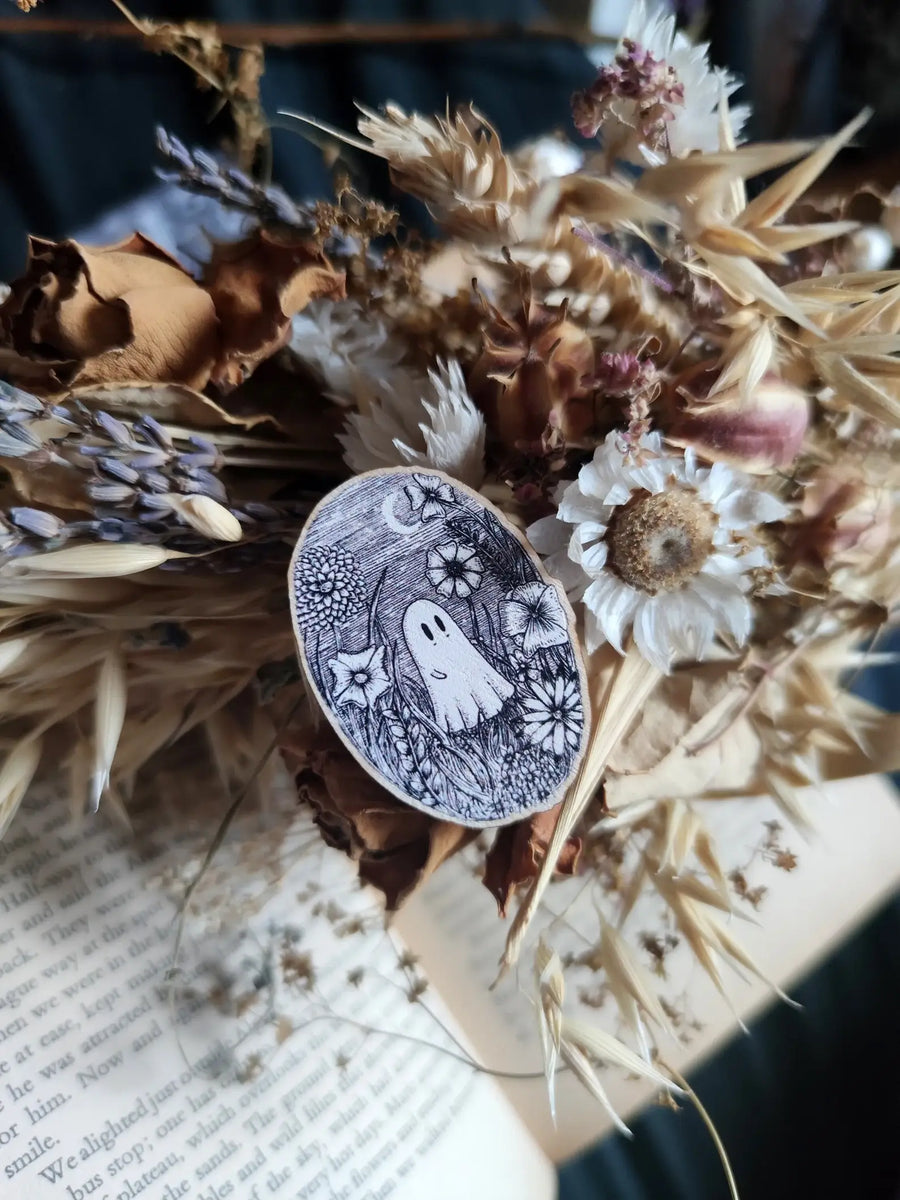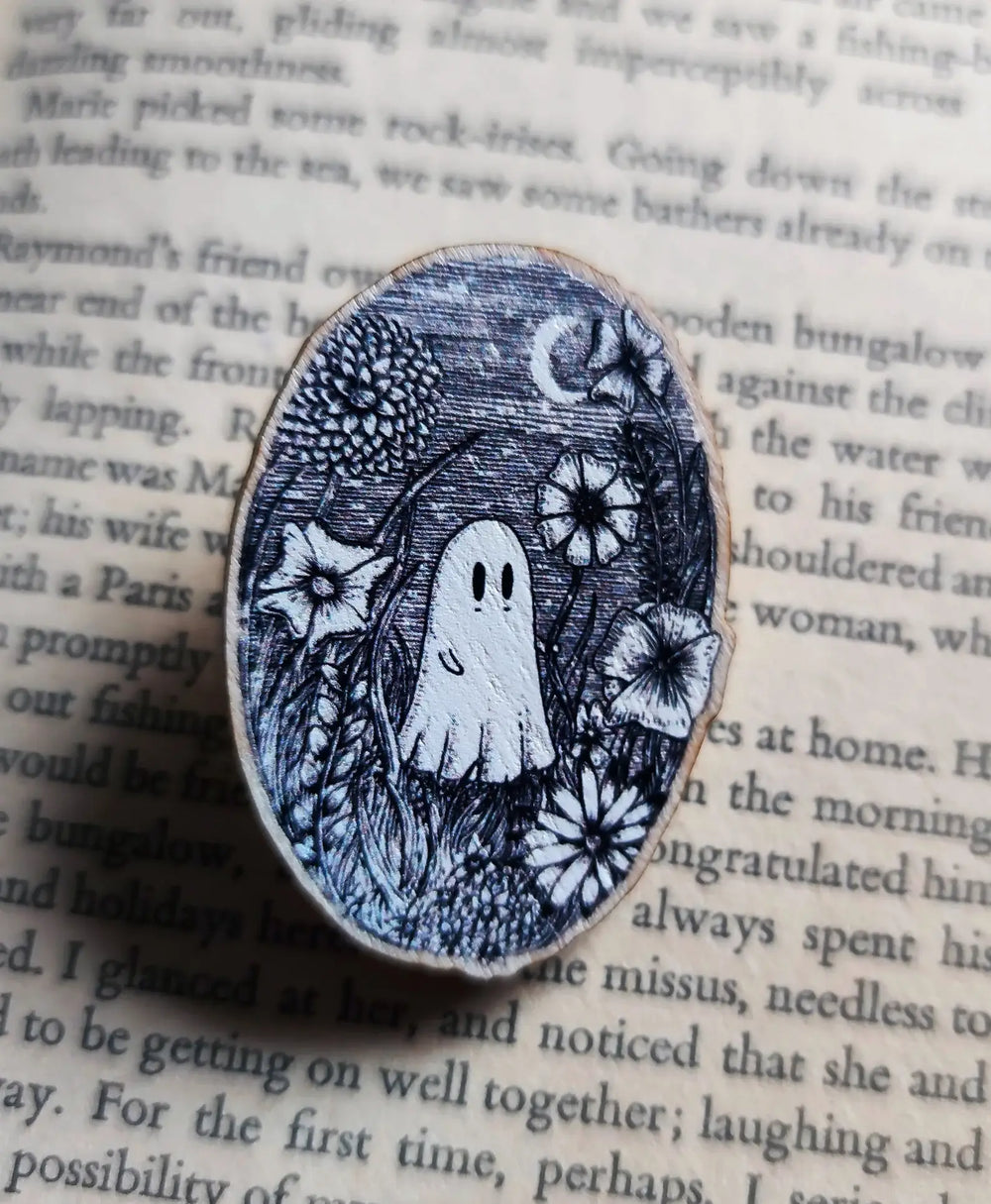 A little ghost in a field of flowers, on a lovely sturdy wooden pin; the design, from an original ink drawing by Jon Turner, is printed onto sustainably sourced textured maple wood, and then lasercut, with a pin back and rubber clutch to the reverse. Approximately 5cm (2 inches) tall. Presented on a backing card.