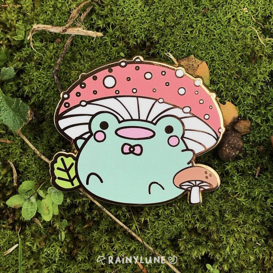 Friend the Frog is now a mushroom and living his cottagecore dreams. he looks like he would be chewy (but he is a metal pin and therefore is not) 🐸🍄 • 1.25 inch hard enamel pin • 2 rubber packing posts  • is not tasty but sure does look cute    please take him away from me before i try to Eat Him
