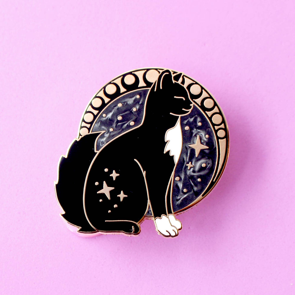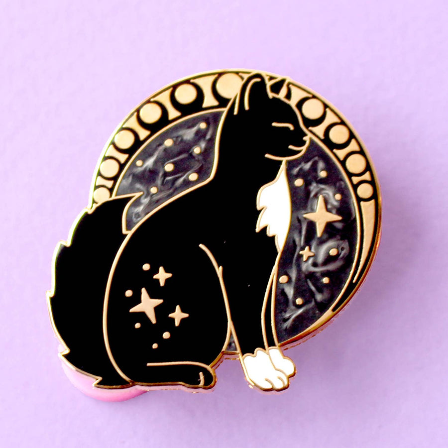 This fabulous monochrome Moon Nouveau Cat features a tuxedo cat against and Art Nouveau styled moon, and a swirly pearlescent background. The pin is secured by two pink heart backs and comes on a special ‘Art Nouveau’ Glitter Punk backing card, making it perfect for a gift or to keep as a special treat for yourself. This pin is part of my Art Nouveau Cats collection – 8 enamel pins based on the fabulous 19th/20th century art movement.