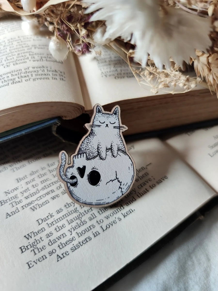 A little cat who has found a cosy place to sit, on a lovely sturdy wooden pin; the design, from an original ink drawing by Jon Turner, is printed onto sustainably sourced textured maple wood, and then lasercut, with a pin back and rubber clutch to the reverse. Approximately 5cm (2 inches) tall. Presented on a spooky backing card.