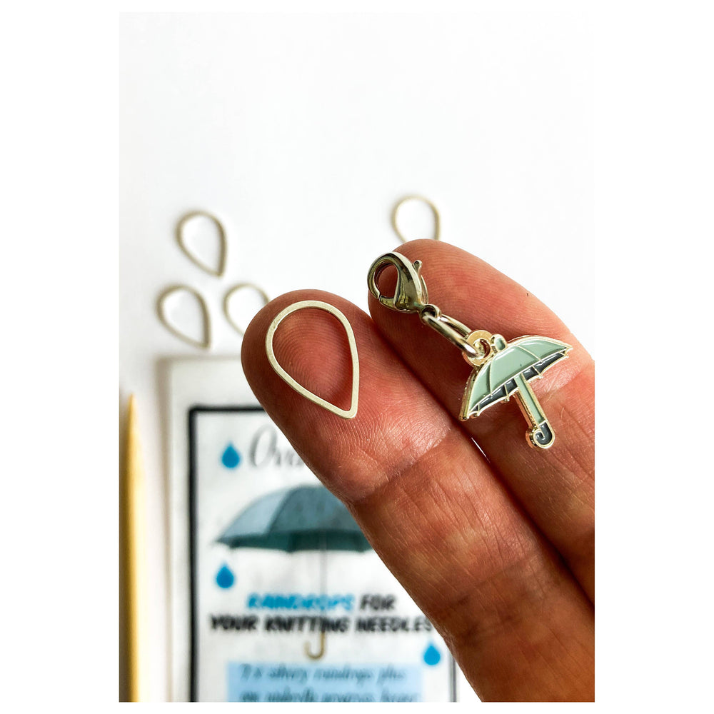 7 x silvery toned raindrop stitch markers plus one custom Firefly Notes enamel umbrella progress keeper. Packaging and sizes as seen in photos.