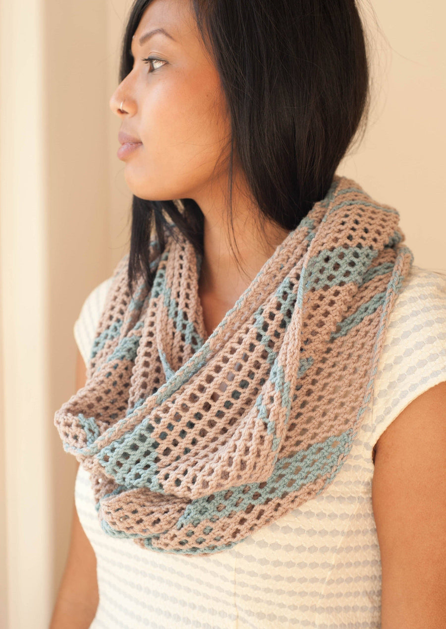 An airy cowl in Chickadee that's light enough to be worn in summer, or doubled around the neck, it will keep you warm year-round. The stitch creates a bias as it's worked for diagonal looking stripes. Designed by Lily May Lewis.