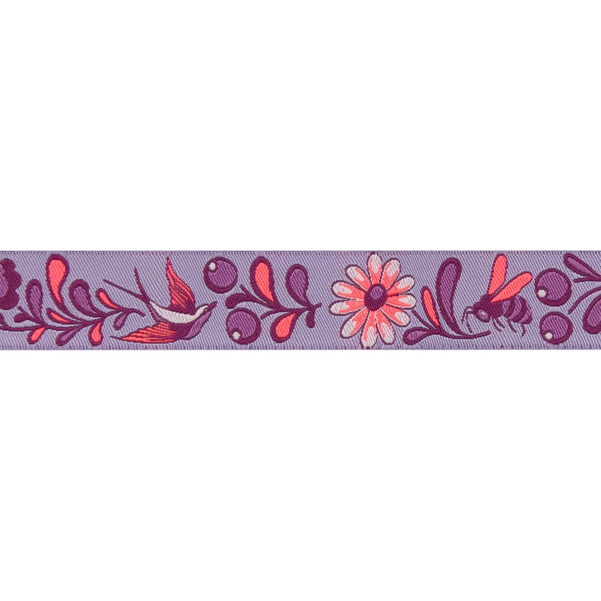 Birds & Bees Mystic/Purple 7/8" wide woven jacquard ribbon. Introducing the remarkable revival of Tula Pink's vintage masterpiece, Birds & Bees. Now, experience the magic as this beloved design comes to life in a stunning remake, infused with the vibrant neon colors of the Everglow collection. Immerse yourself in a whimsical world where playful birds and buzzing bees flutter amidst an electrifying display of vivid orange, vibrant pink, lush purple, and radiant green. The Birds & Bees remake seamlessly blends the timeless charm of the original design with the modern brilliance of Everglow's neon palette. Ignite your creativity and embark on an extraordinary artistic journey. Let the enchanting interplay between classic inspiration and contemporary vibrancy ignite your imagination and bring forth truly remarkable creations. 100% polyester, washable on a gentle cycle.