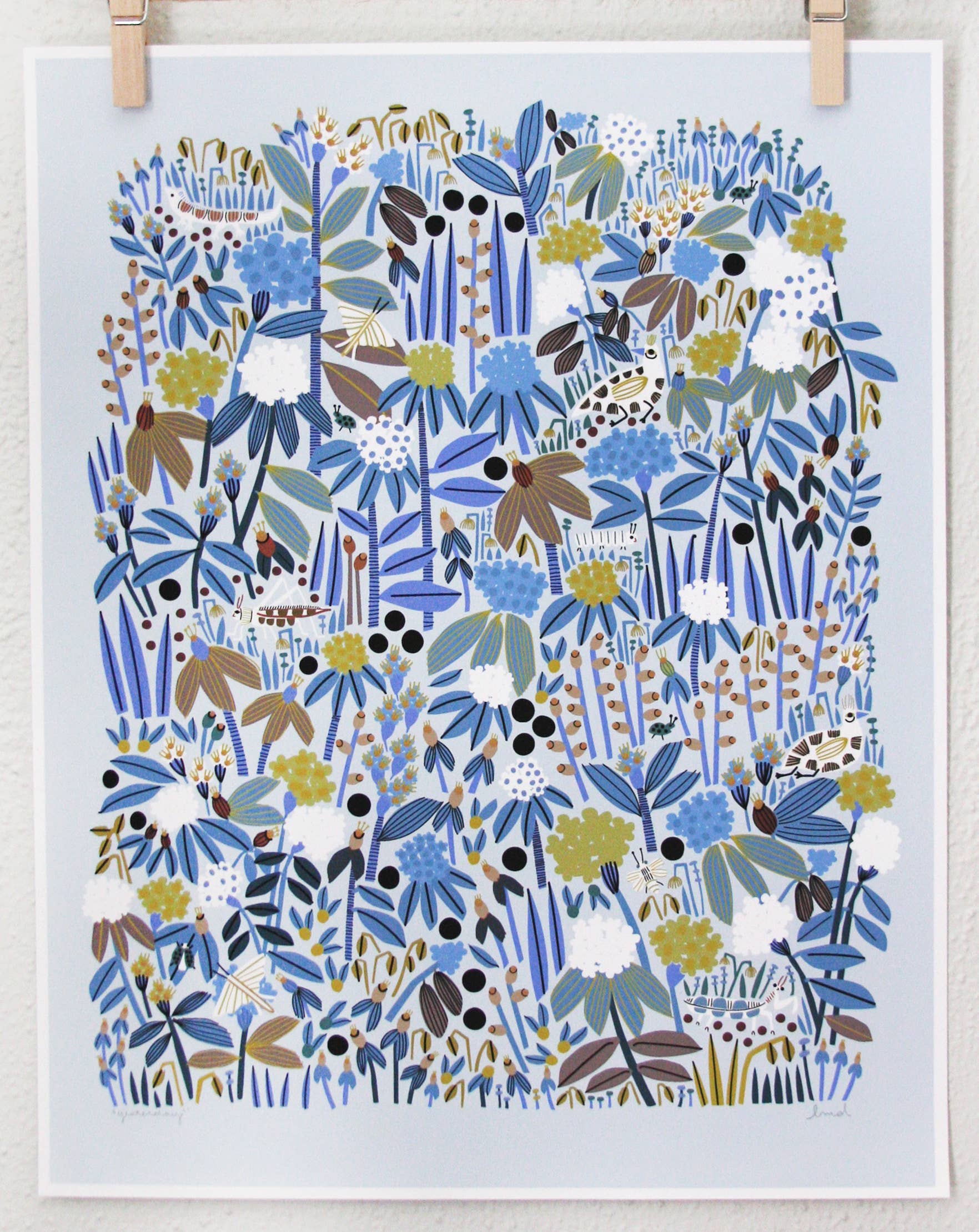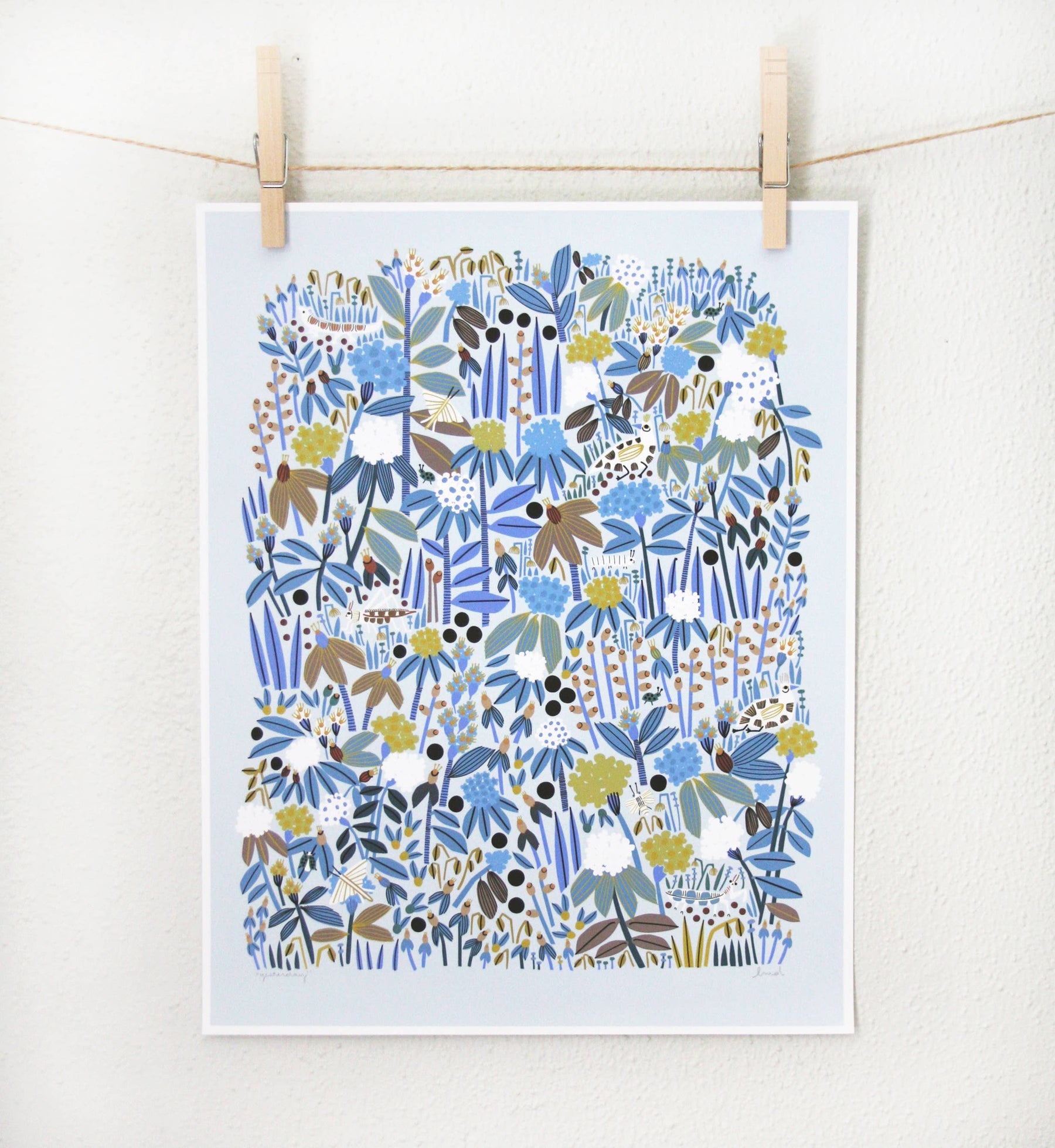 Printed with pigment ink on 100 lb cotton paper. Will be packaged in a cello sleeve with chipboard backing and branded info tag. All prints are titled and signed at the bottom. Sizes 11" x 14" available.