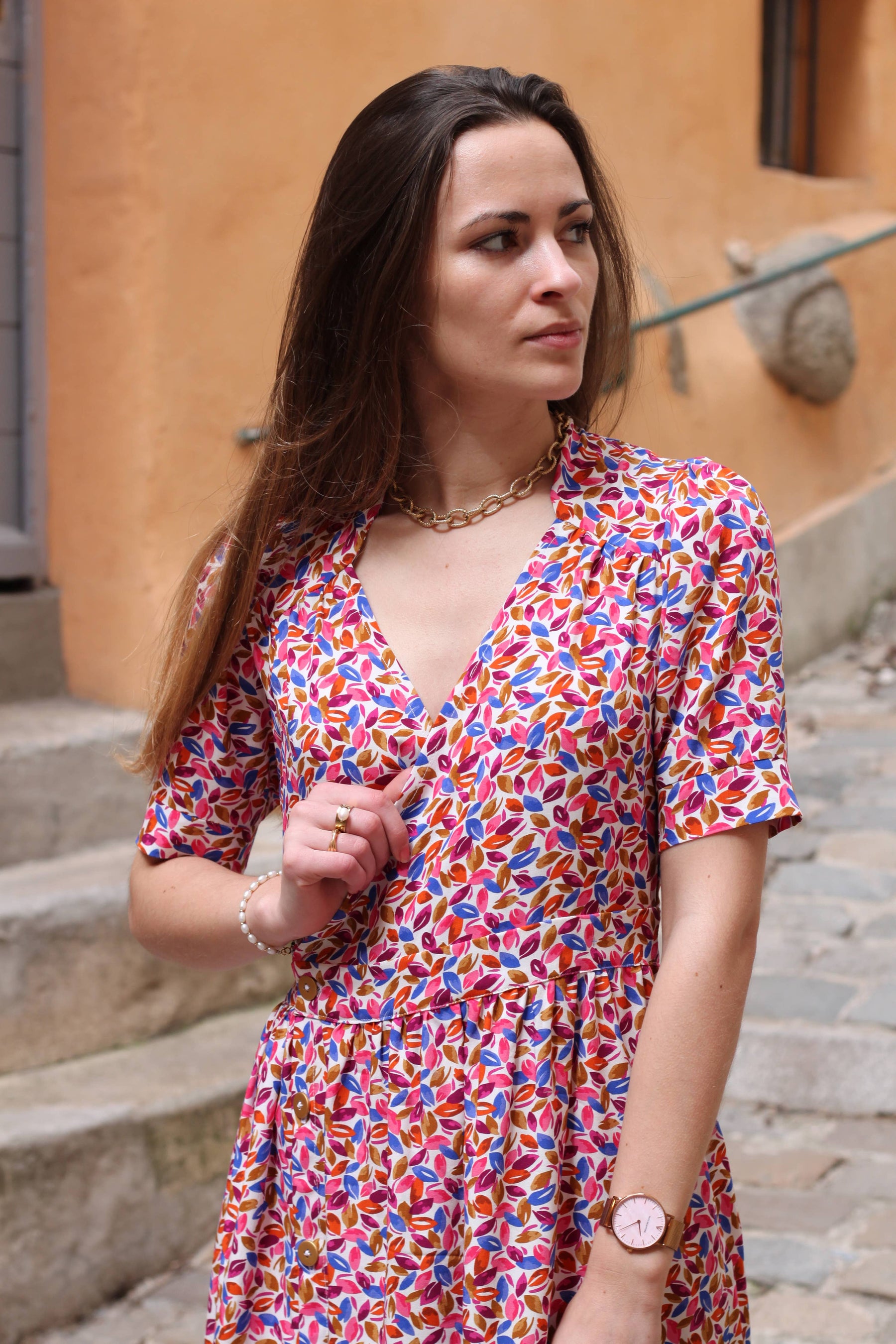 Garance is a pretty wrap dress, belted at the waist with ruffles on the skirt and a ruched cut at the shoulder.
