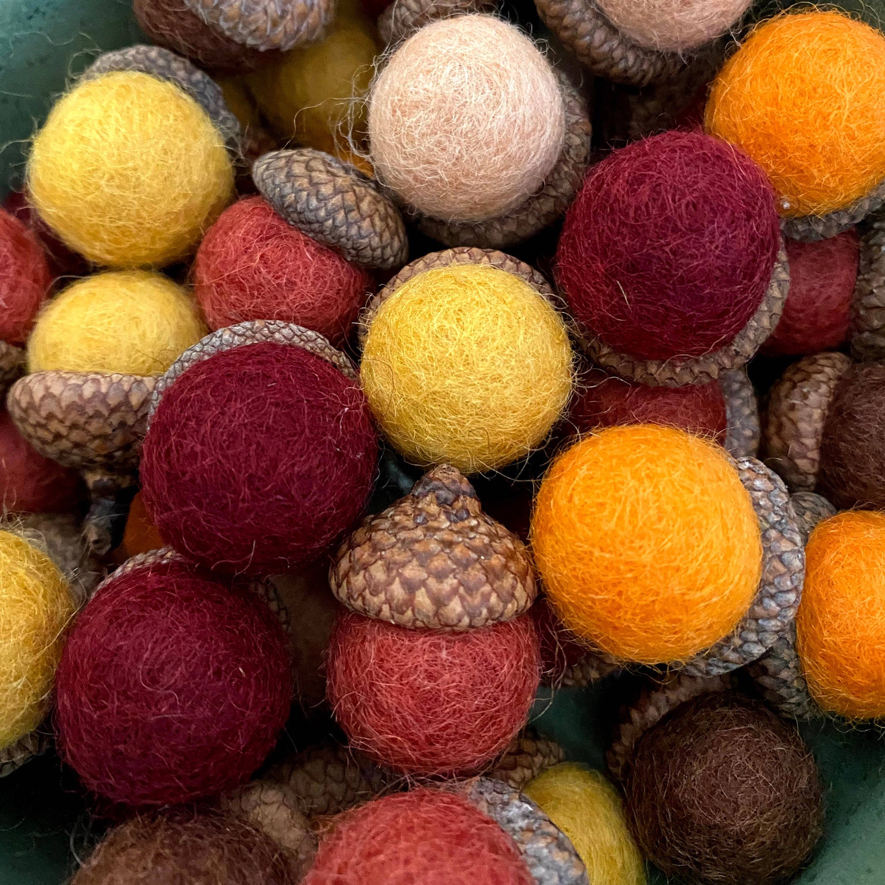 We paired locally foraged acorn tops with felted wool balls in gorgeous colors for these lovely tabletop ornaments. Fill a small dish or bowl, use in a centerpiece or to line up upon a mantel.