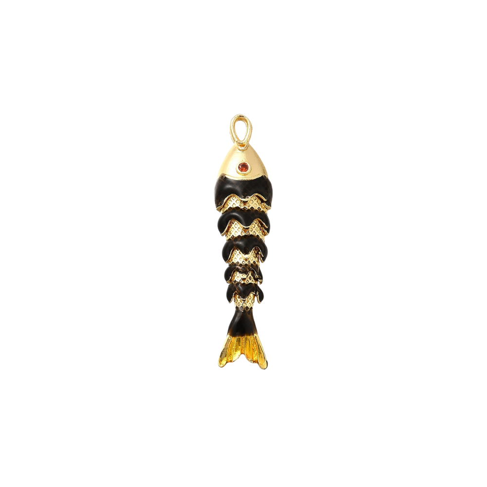 Our Gold Blackwater Fish Charm is a captivating piece that brings the intriguing beauty of the deep to your jewelry collection. This charm features a sleek fish silhouette, crafted in gleaming gold with a rich blackwater enamel finish that is both sophisticated and alluring. Its bold color and sleek design evoke the quiet grace of a fish swimming in the depths, while the vibrant red stone eye adds a captivating pop of color and life.