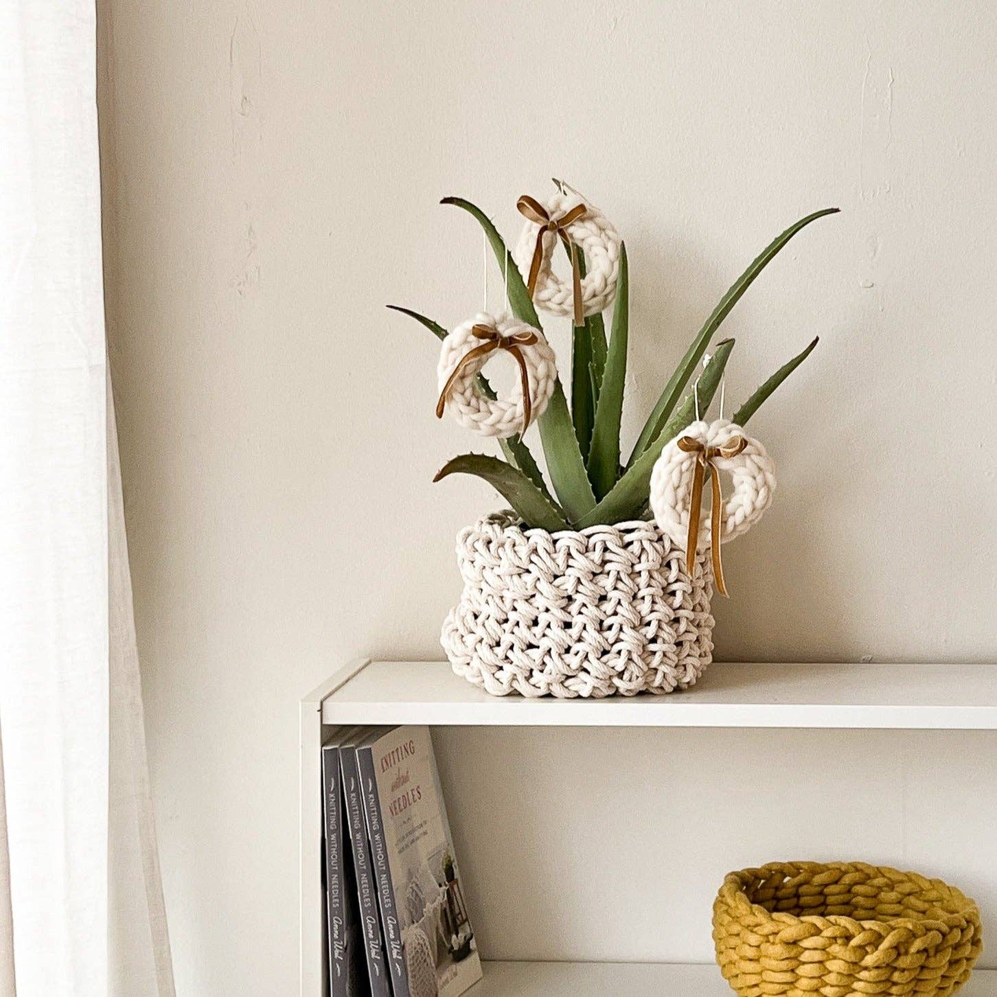 Finger knit these lovely, wooly holiday wreaths to make your home cozy and warm this winter. Make these for your tree or mantle or add one to each plate at the table. Finger knitting is easy for kids down to the age of 5 so do them together with your family as a joint craft to enjoy. Finished with a delicate velvet ribbon these look elevated and elegant for a fancy dining table as well.