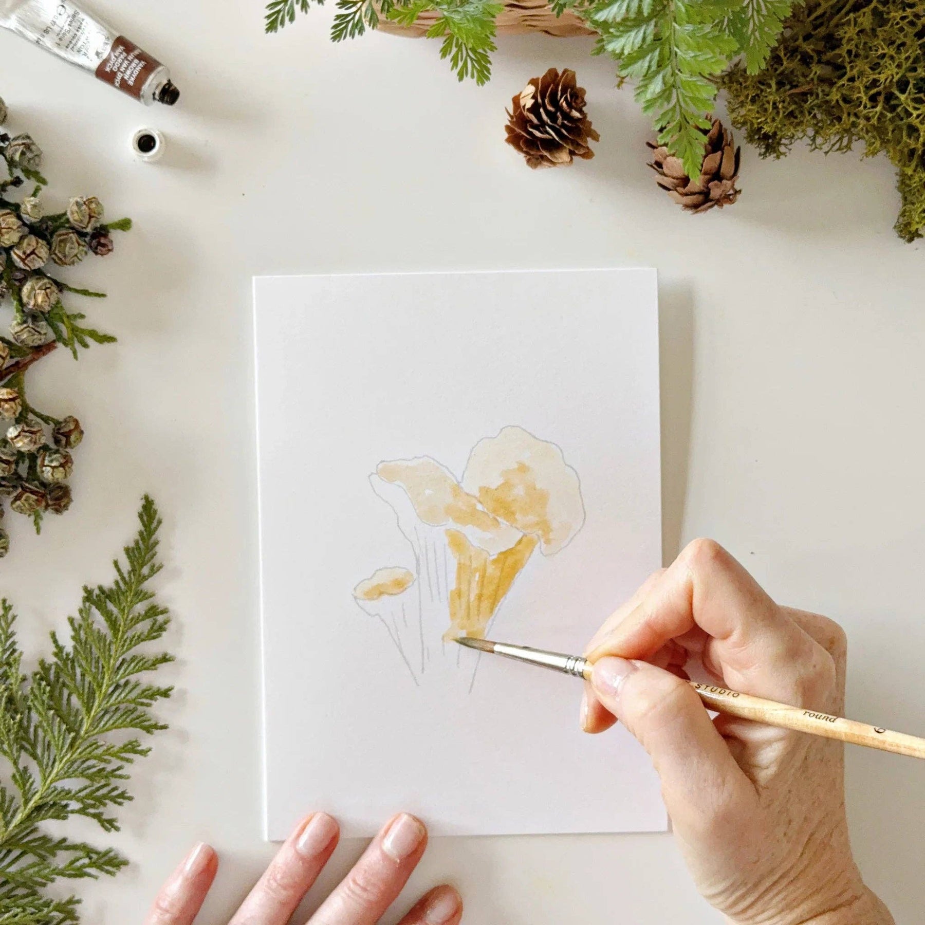 Paint your own special cards and send to loved ones! Sketches are printed on the front of each card with simple instructions for you to paint in with watercolors. You'll receive eight cards with two of each mushroom illustration. Perfect for artists of all ages!
