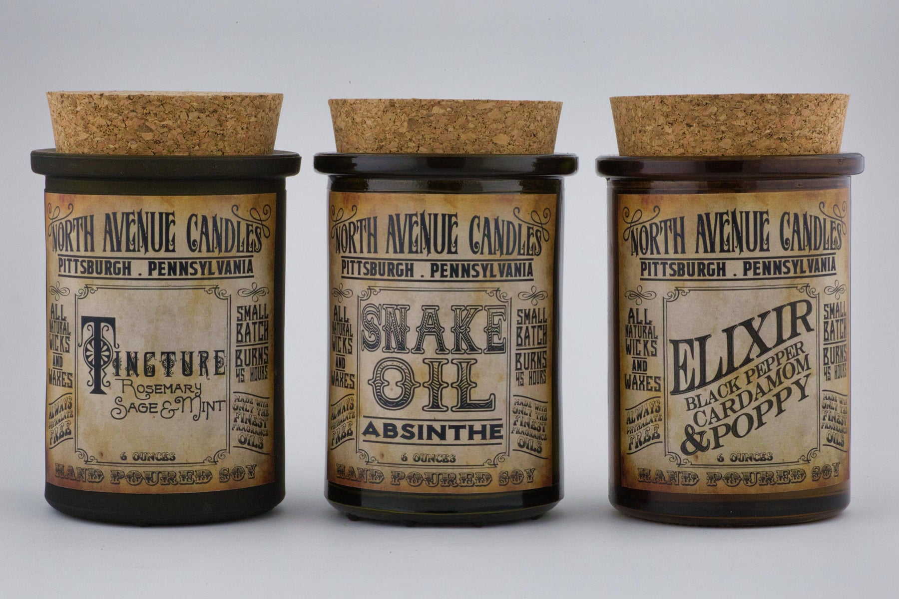 The Apothecary is a line of candles inspired by patent medicines of the 1800s. Without having any proof to their claims, charlatans and faux “doctors” were able to travel from town to town selling their snake oils, nostrums, and miracle cure-alls.
