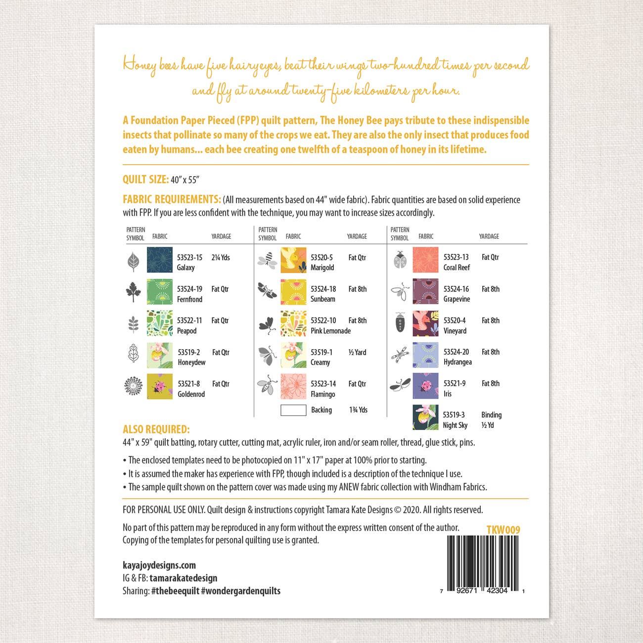 "The Honey Bee", #9 in the Wondergarden range. Foundation Paper Pieced Quilt Pattern. Finished Quilt Size: 40" x 55" Includes: Full size templates), instructions (including FPP how-to), diagrams, overview assembly chart, fabric requirement list.