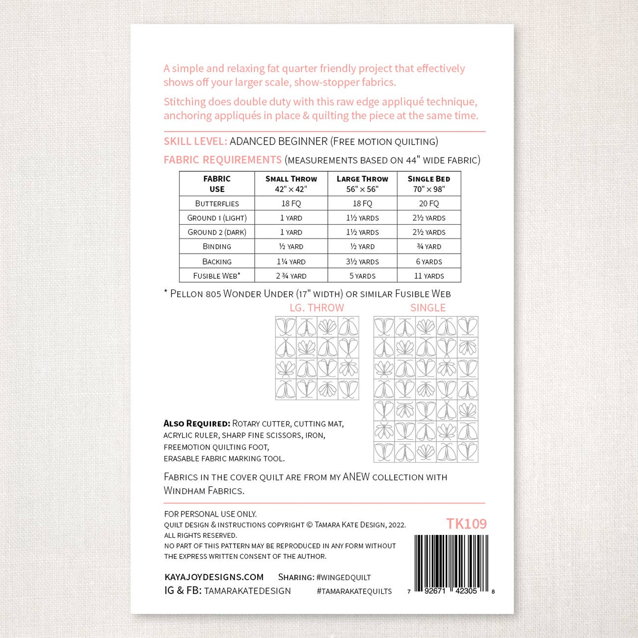 Includes: Full sized templates, instructions, diagrams, layout diagram for easy template placement, fabric requirement list.