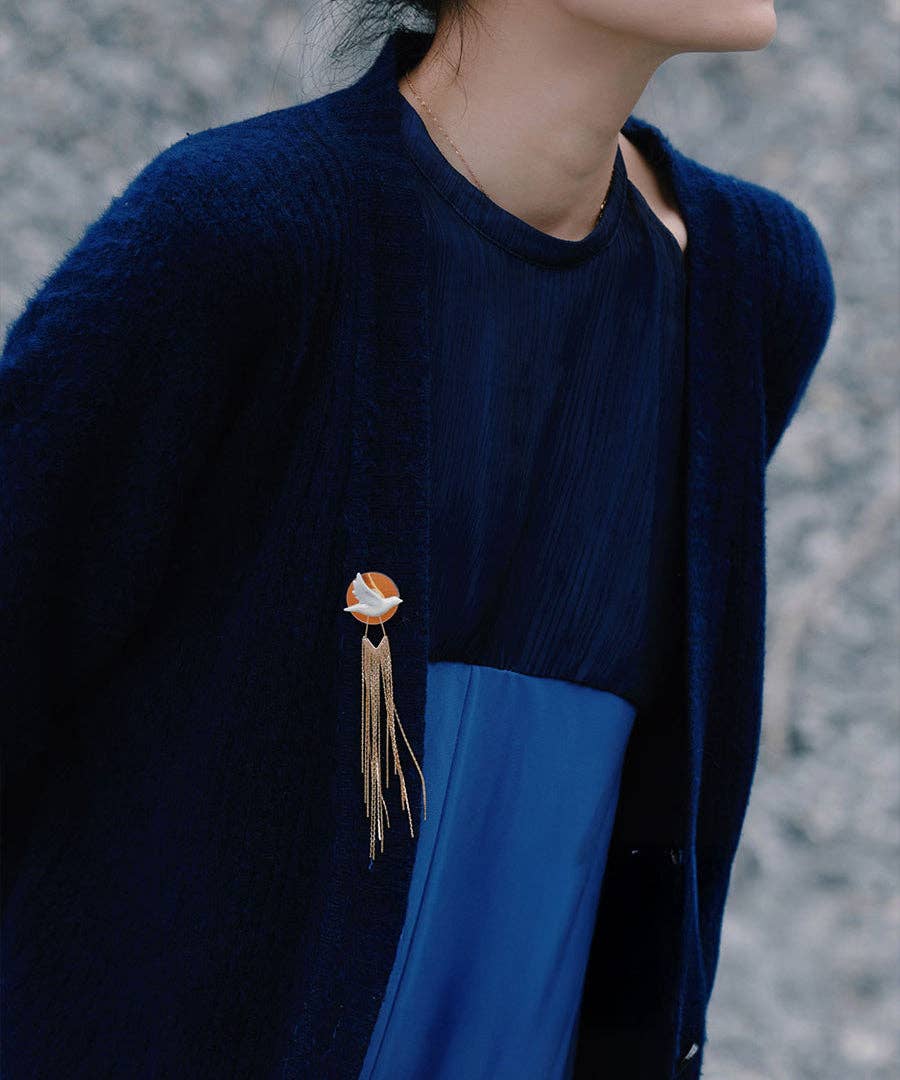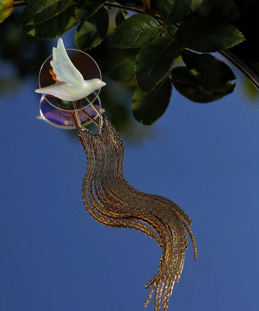 This brooch is a poetic play on perspective: a ceramic dove and its mirrored twin, joined by a holographic acrylic disc that shimmers in the sun. Wavy tassels bring motion to the design, like wind trailing a wingbeat. A piece about connection & belonging.